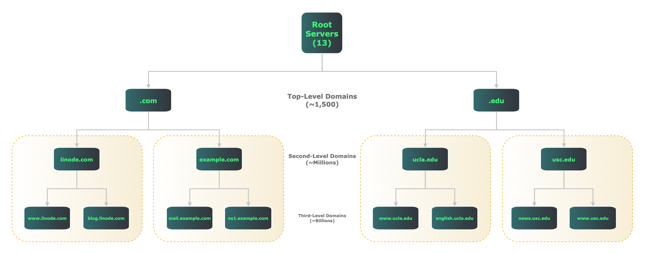 Regardless of level, all DNS name servers provide information about items within their domains. For example, linode.com name servers provide information about hostnames, addresses, mail servers, and name servers within that domain.
